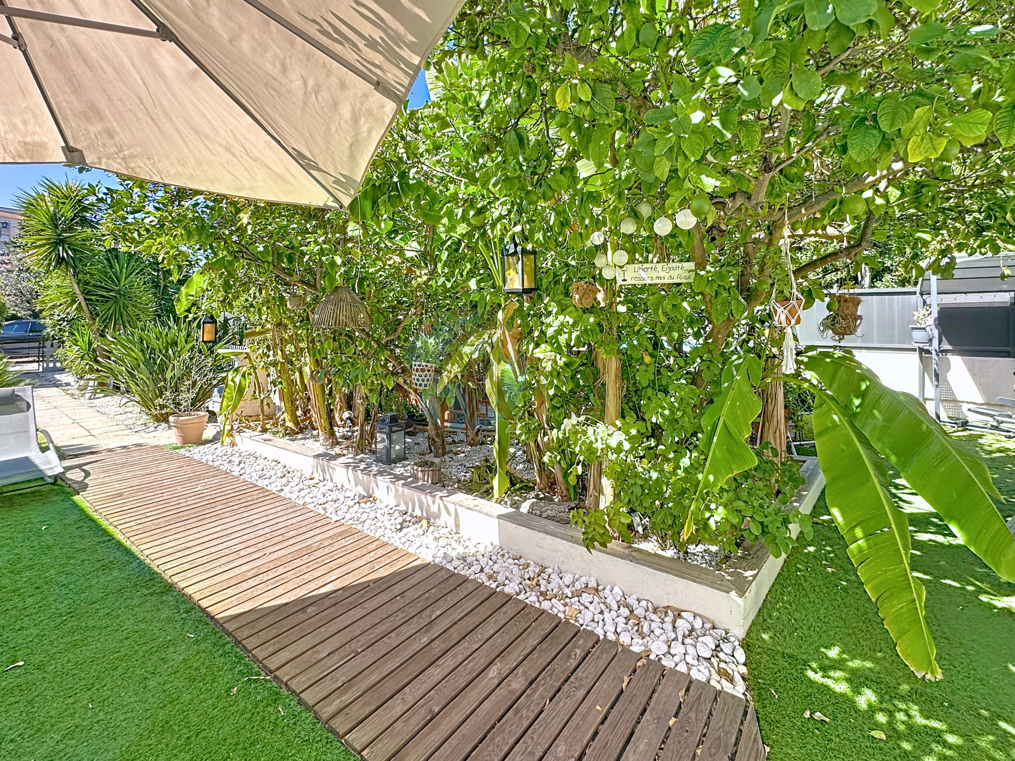 À l’extérieur : • Superbes espaces de détente : patio/terrasse idéal pour vos repas en plein air, jeu de boules pour des moments conviviaux, piscine hors-sol pour vous rafraîchir l’été. • Jardin verdoyant avec arrosage automatique et puits pour l’irrigation • 5 places de stationnement et portail électrique pour votre confort.