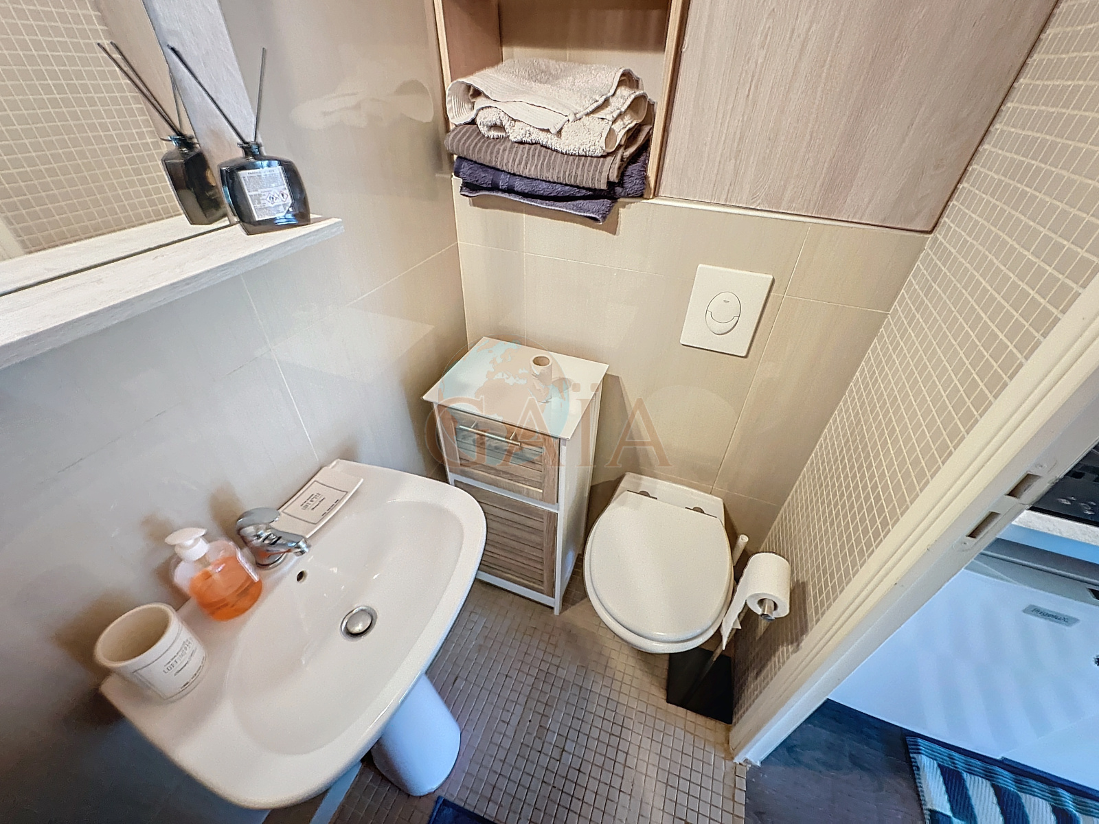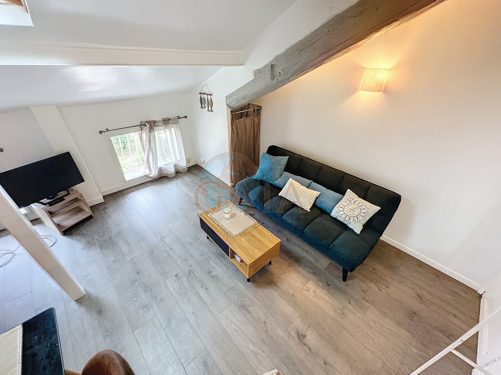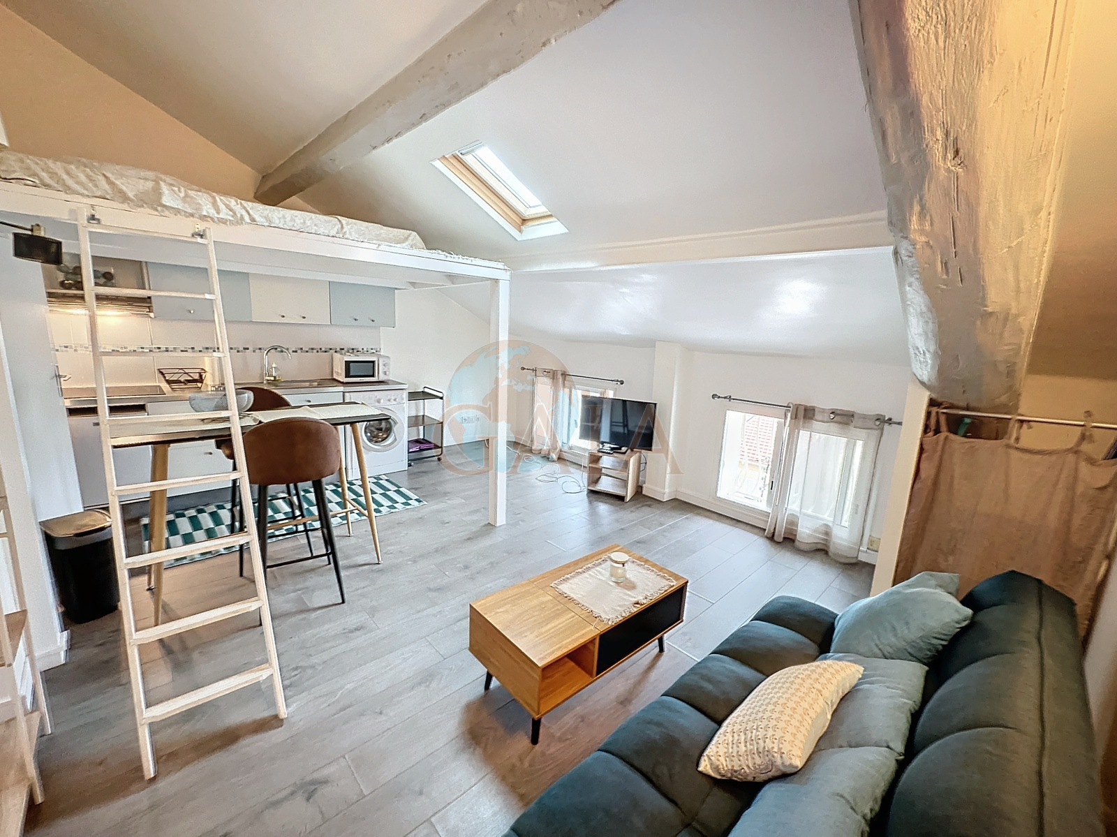 Bel espace de vie, rangements, coin cuisine équipée, chambre en mezzanine, SDE avec WC. Lumineux car 2 fenètres double vitrage et vélux de toit.